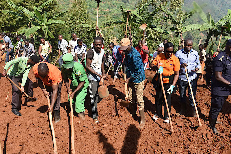 The community work terraced a parcel where will be built a house for the identified teen mother. It was joined by different government officials including the Governor for the Western Province, Munyantwali Alphonse and Mayor of Ngororero Ndayambaje Godefroid the Chief Gender Monitor and Deputy Chief Gender Monitors. GMO has molibilized the funds that will be used to buy equipments to build a house.